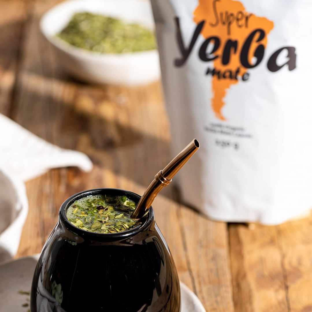 - nu este nevoie ca frunzele sa fie indepartate dupa infuzare, deoarece ceaiul se soarbe printr-un pai confectionat din inox sau bambus numit “bombilla”, care are un filtru sau o sita in capatul introdus in bol, impiedicand astfel fragmentele de frunze sa patrunda in interiorul paiului