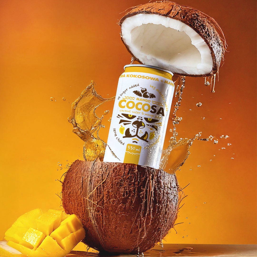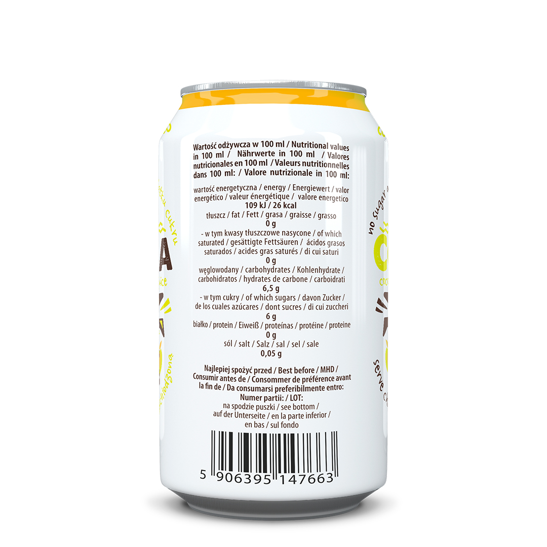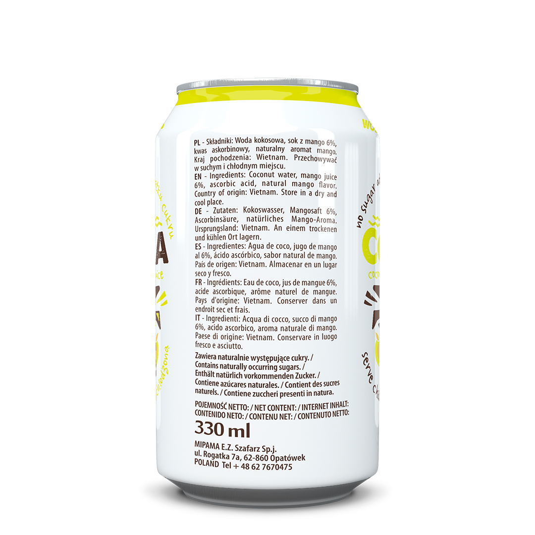 Apa de cocos cu mango, bogata in electroliti esentiali (potasiu, calciu, magneziu), hidrateaza, sustine sanatatea oaselor.