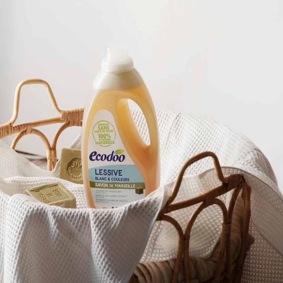 Detergent lichid bio concentrat cu săpun de Marsilia Ecodoo, cu formulă naturală și eficientă de la 30°C, curăță profund rufele albe și colorate, utilizare economică de până la 66 de spălări.