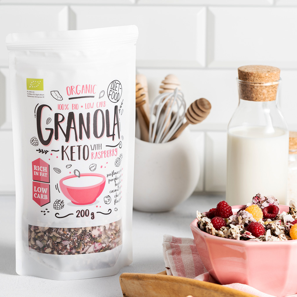 - Granola Bio Vegan Keto cu Zmeură de la Diet Food este un mic dejun sau gustare perfectă pentru cei care își doresc o alimentație sănătoasă și echilibrată.