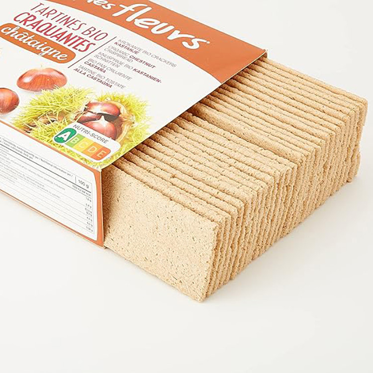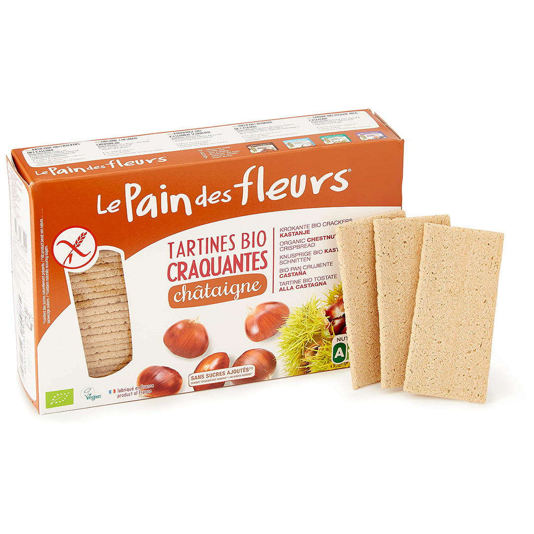 Pâinea crocantă fără gluten cu făină de castane de la Le Pain des Fleurs este o gustare sănătoasă, fără zahăr adăugat, plină de savoare cu aromă unică și delicată, perfectă pentru cei care urmează un regim alimentar fără gluten sau pentru vegani.